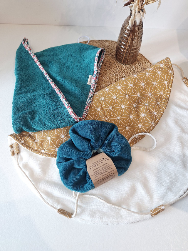 • 1 serviette à cheveux Taille enfant pour un séchage rapide des cheveux et grâce à son lien d'attache elle tient seule sur la tête.